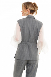 Жилет: Фактура: гладкая. Ткань: костюмная. Силуэт: полуприлегающий. Воротник: пиджачный. Застежка: двубортная на пришивные кнопки. Карманы: по переду прорезные в рамку с клапанами. Конструктивные элементы: талиевые вытачки, средний шов по спинке, разрезы по боковым швам, съемный пояс. Подкладка: есть. Брюки: Фактура: гладкая. Ткань: костюмная. Силуэт: прямой. Карманы: наклонные к боковым швам. Застежка: спереди на молнию и крючок. Конструктивные элементы: вытачки по задним половинкам, стрелки по передним и задним половинкам, отрезной пояс на обтачке, шлевки. Тип посадки: средняя.