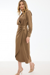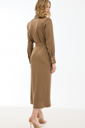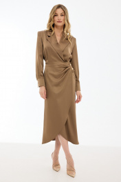 Платье: Фактура: гладкая. Ткань: плательная. Силуэт: свободный верх с расширенной формой плеча и полуприлегающий низ. Воротник: пиджачный. Рукава: длинные. Застежка: потайная "молния" сбоку. Конструктивные элементы: отрезное по линии талии, по переду юбки имитация запаха с драпировкой на планке с декоративными пуговицами, манжеты по низу рукавов на петли и пуговицы. Подкладка: без подкладки.