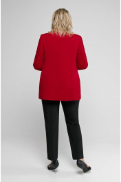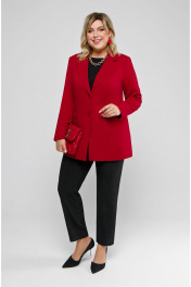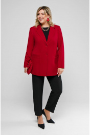 Комплект-двойка из жакета и брюк. Жакет из костюмной ткани, на подкладке. Полочки с центрально-бортовой застёжкой на две петли-пуговицы. Из плечевых швов до низа идут рельефы. Горизонтально расположенные карманы с листочками выходят из швов рельефов. Спинка со средним швом и вертикальными рельефами из плечевых швов. Воротник классический, пиджачного типа с отворотами лацканов. Рукава втачные, двухшовные. Изделие с плечевыми накладками. Брюки на притачном поясе, застежка спереди на молнию и пуговицу, боковые карманы «хулиганы». Длина блузы – 78 см., брюк - 96 см.