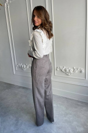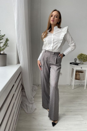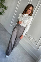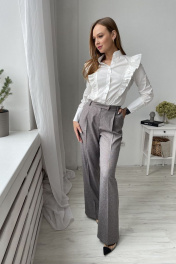 Комплект состоит из блузки и брюк прямого кроя. В брюках карманы по бокам. Блузка полуприлегающего силуэта,с декоративными складками спереди.