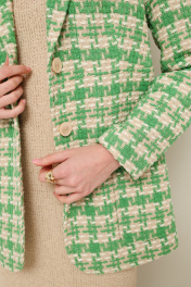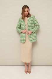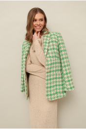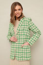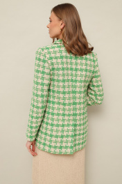 Жакет прямого силуэта, на подкладке. Материал легкий. Жакет застегивается на пуговицы спереди. Ткань неплотная, мягкая на ощупь. Карманы функциональные. Длина жакета 72 см. Длина рукава 61 см.