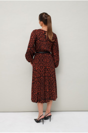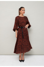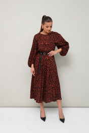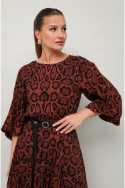 Платье отрезное по линии талии на резинке, выполнено из вискозы с принтом рептилии. Горловина с окантованным вырезом круглой формы. Рукава-реглан, в длине 3/4 собраны на резинку по низу. По спинке обработан разрез с застежкой в среднем шве на навесную петлю и пуговицу. В комплекте прилагается съемный ремень.