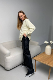 Костюм состоит из трикотажного худи и брюк из эко-кожи. Худи свободного силуэта, из ткани трехнитка ( трикотаж средней плотности).Брюки прямого кроя из мягкой эко-кожи, не твердой, не трещит, мягкая внутри и обработано хлопковой подкладкой.