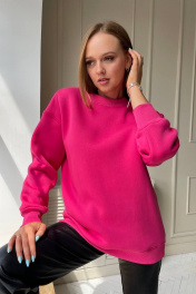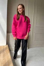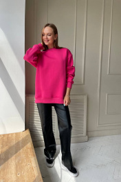Костюм состоит из трикотажного худи и брюк из эко-кожи. Худи свободного силуэта, из ткани трехнитка ( трикотаж средней плотности). Брюки прямого кроя из мягкой эко-кожи, не твердой, не трещит, мягкая внутри. Длина брюк 119 см.