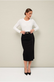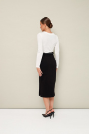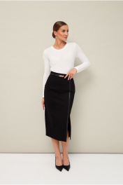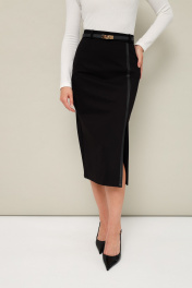 Комплект двойка:джемпер и юбка. Джемпер выполнен из трикотажного полотна из мерсиризированной пряжи, что придает шелковистый блеск,эластичность, мягкость. Длина 55 см.Рукав 61 см. Юбка прилегающего силуэта, из плотного трикотажа, в кожаной декоративной обаботкой элементов спереди.Ремень в комплекте. Длина 76 см., талия 66/70/74/78 см.