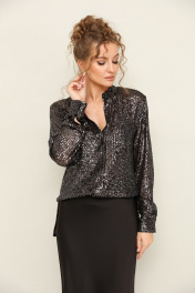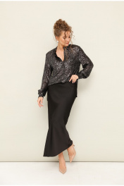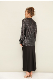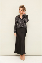Комплект двойка, состоящий из блузки и юбки. Блузка с пришитыми пайетками, прямого кроя, застегивается на пуговицы. Юбка длинная из сатина, с потайной молнией сбоку.