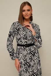 Женское платье полуприлегающего силуэта, отрезное по линии талии, выполнено из джинсовой ткани с анималистичным принтом. Фигурный вырез горловины с притачным воротником-стойкой. Лиф с центральной застежкой на петли ,пуговицы и с накладными карманами с клапанами. Юбка с разрезом в среднем шве, который обеспечивает свободу движения. Рукава втачные с притачной манжетой с застежкой на пуговицы. Спинка с талиевыми вытачками. В комплекте прилагается ремень.