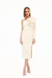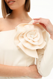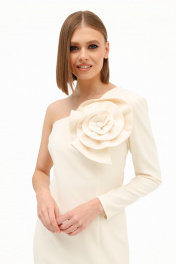 Платье женское прилегающего силуэта с ассиметричной горловиной и одним рукавом. Перед с одним рельефом заканчивающимся разрезом и с двумя вытачками. Спинка со средним швом и двумя вытачками. Рукав втачной одношовный длинный со сборкой по окату. Платье с застёжкой на потайную тесьму молнию в боковом шве. Декором служит съемный цветок. Длина рукава – 62 см, длина изделия – 120 см.