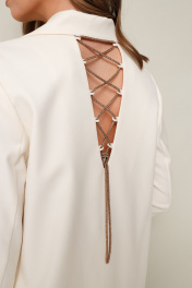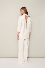 Стильный комплект, состоящий из жакета и брюк. Жакет современного прямого силуэта из костюмной ткани с центральной застёжкой на петли и пуговицы. Воротник пиджачного типа с отложными лацканами. Спереди обработаны накладные карманы. Спинка с V-образным вырезом, который зашнурован акцентной декоративной тесьмой. Рукава втачные, длина 3/4. Изделие на х/б подкладке. Брюки прямого силуэта из костюмной ткани с заутюженными стрелками. Пояс притачной с застежкой на пуговицу и тесьму-молнию, сзади на резинке.