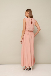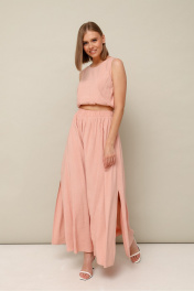 Элегантный комплект, состоящий из блузки и юбки. Округлый вырез горловины. Низ блузки собран на резинку. По спинке разрез с застежкой на пуговицу и навесную петлю. Юбка Аобразного силуэта, с притачным поясом на резинке и высокими разрезами по низу. В боковых швах обработаны карманы.
