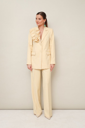 Эффектный 2-предметный комплект, состоящий из жакета и брюк, выполненный из костюмной ткани. Жакет женский полуприлегающего силуэта с центральной застежкой на петли и обтяжные пуговицы. Воротник пиджачного типа с отложными лацканами. Спереди обработаны прорезные карманы в рамку с клапанами. Рукава втачные двухшовные. Спинка со средним швом и рельефами. Изделие обработано подкладкой. Брюки прямого силуэта с заутюженными стрелками и с боковыми наклонными карманами. Пояс притачной с застежкой на пуговицу и тесьму-молнию, по спинке пояс на резинке для регуляции размера. В комплекте прилагается съемная брошь из основной ткани.