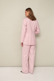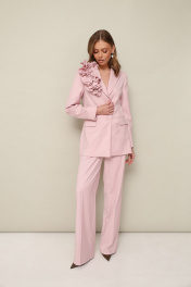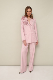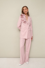 Эффектный 2-предметный комплект, состоящий из жакета и брюк, выполненный из костюмной ткани. Жакет женский полуприлегающего силуэта с центральной застежкой на петли и обтяжные пуговицы. Воротник пиджачного типа с отложными лацканами. Спереди обработаны прорезные карманы в рамку с клапанами. Рукава втачные двухшовные. Спинка со средним швом и рельефами. Изделие обработано подкладкой. Брюки прямого силуэта с заутюженными стрелками и с боковыми наклонными карманами. Пояс притачной с застежкой на пуговицу и тесьму-молнию, по спинке пояс на резинке для регуляции размера. В комплекте прилагается съемная брошь из основной ткани.