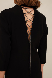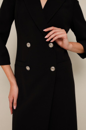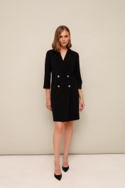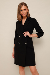 Платье-пиджак с двубортной застёжкой на петли и пуговицы, спереди обработаны карманы с листочками. Воротник пиджачного типа с отложными лацканами. Спинка с V-образным вырезом, который зашнурован акцентной декоративной тесьмой. Рукава втачные, длина 3/4. Изделие на подкладке.