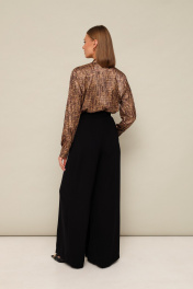 Комплект 2-предметный, состоящий из блузки и брюк. Блузка прямого кроя, с притачным воротником-стойкой по горловине. Застежка центральная на петли и пуговицы. Рукава длинные с притачными манжетами. В боковых швах по низу обработаны разрезы. Брюки-кюлоты современного силуэта, расширенные к низу, с заутюженными стрелками. Спереди брюки обработаны на запах с застежкой на полукольца, притачной пояс - на пуговицу и тесьму-молнию.