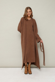 Женский комплект, состоящий из кардигана и платья, выполнен из мягкого уютного трикотажного полотна. Горловина спинки и борта обработаны притачной планкой. Длинные рукава со спущенной линией втачивания плеча. В боковых швах внутренние карманы. Трикотажное платье полуприлегающего силуэта в длине миди. Округлый вырез горловины. Рукава втачные в длине до локтя. В левом боковом шве обработан высокий разрез. В комплекте прилагается пояс из основной ткани.