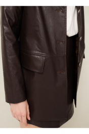 Стильный 2-предметный комплект, состоящий из жакета и юбки, выполненный из экокожи. Жакет современного прямого силуэта однобортный, застёгивающийся на петли и пуговицы. Воротник пиджачного типа с отложными лацканами. Спереди в подрезе обработаны карманы с клапанами. Рукава втачные двухшовные. Спинка со средним швом. Изделие на подкладке. Юбка в длине мини, на обтачке по поясу. Застежка на потайную тесьму-молнию в среднем шве спинки.
