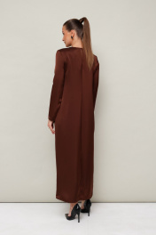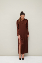 Стильное платье прямого силуэта, выполнено из струящейся ткани с благородным матовым блеском. Округлый вырез горловины. Рукава длинные втачные. Внизу обработан высокий разрез с кружевной отделкой. Застёжка по спинке в среднем шве «капля» на пуговицу и навесную петлю.