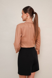 Стильный комбинезон с имитацией двубортной застежки, отрезной по линии талии. Лиф с воротником пиджачного типа с отложными лацканами. Рукава втачные двухшовные с отлетными шлицами, длина ¾. Юбка-шорты с центральной застежкой на потайную тесьму молнию. Спереди по юбке обработаны карманы в рамку. Лиф и рукава выполнены из вискозы, юбка-шорты – из костюмно-плательной ткани.