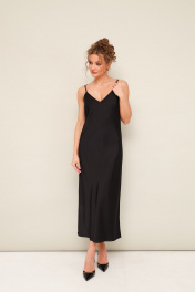 Платье-комбинация полуприлегающего силуэта, выполнено из струящейся ткани с матовым блеском. Крой по косой деликатно подчеркивает фигуру и скрывает недостатки. Основные бретельки регулируются по длине, декоративный шнур фиксируется на петлю по спинке. Платье без подкладки.