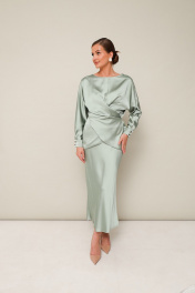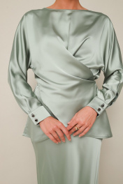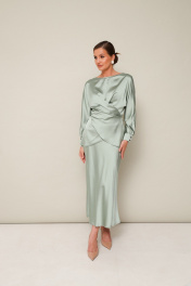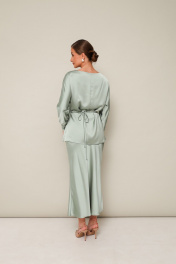 Элегантный 2-предментный комплект, состоящий из блузки и юбки, выполненный из струящейся ткани с деликатным блеском. Блузка прямого кроя с акцентом на талии. Вырез горловины-лодочка. Рукава цельновыкроеные с манжетами с застежкой на петли и пуговицы. По переду обработан разрез с завязками для фиксации половинок переда на спинке. Низ переда фигурный, спинка со средним швом и прямым низом, в боковых швах высокие разрезы. Юбка с кроем «по косой» в длине миди, пояс на обтачке, застежка в боковом шве на потайную тесьму молнию.