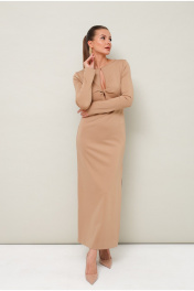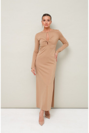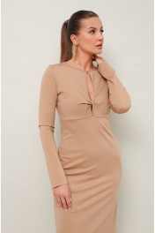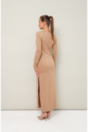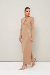 Платье прилегающего силуэта в длине миди, выполнено из эластичного трикотажного полотна. Горловина округлой формы с вырезом «капля». На лифе обработан декоративный узел с подрезом под линией груди. Рукава длинные втачные. В боковом шве высокий разрез. Спинка со средним швом.
