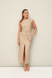 Стильное платье отрезное по линии талии в длине миди, выполнено из экокожи. Округлый вырез горловины. По плечевым швам лифа и по талии обработаны защипы. Юбка со средним швом, переходящим в разрез. Спинка в V-образным вырезом. В среднем шве застёжка на потайную тесьму молнию. В комплекте прилагается пояс из основной ткани с обтяжной пряжкой.