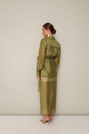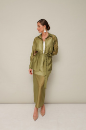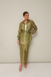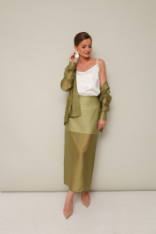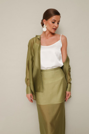 Элегантный 3-предментный комплект, состоящий из топа, блузки и юбки. Топ полуприлегающего силуэта, выполнен из струящейся ткани с матовым блеском. Бретели регулируются по длине. Блузка и юбка, выполнены из вискозного полотна. Блузка прямого кроя, горловина с рубашечным воротником на отрезной стойке, центральная застежка на петли и обтяжные пуговицы. Рукава втачные с манжетами с застежкой на пуговицы. В боковых швах обработаны разрезы. Спинка с отрезной кокеткой и встречной складкой. Юбка на подкладке в длине миди. Притачной пояс с частичной резинкой для регуляции по талии. Застежка в среднем шве по спинке на пуговицу и потайную молнию. Для удобства движения сзади обработана шлица. В комплекте прилагается пояс основной ткани.