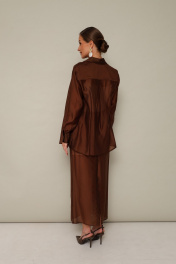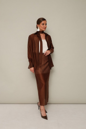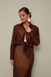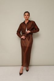 Элегантный 3-предментный комплект, состоящий из топа, блузки и юбки. Топ полуприлегающего силуэта, выполнен из струящейся ткани с матовым блеском. Бретели регулируются по длине. Блузка и юбка, выполнены из вискозного полотна. Блузка прямого кроя, горловина с рубашечным воротником на отрезной стойке, центральная застежка на петли и обтяжные пуговицы. Рукава втачные с манжетами с застежкой на пуговицы. В боковых швах обработаны разрезы. Спинка с отрезной кокеткой и встречной складкой. Юбка на подкладке в длине миди. Притачной пояс с частичной резинкой для регуляции по талии. Застежка в среднем шве по спинке на пуговицу и потайную молнию. Для удобства движения сзади обработана шлица. В комплекте прилагается пояс основной ткани.