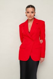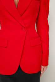 Силуэтный жакет с подчеркнутой линией талии. Смещенная застежка на петлю и пуговицу. Воротник пиджачного типа с отложными лацканами, край борта скругленный по низу жакета. Спереди обработаны прорезные карманы в рамку с клапанами и нагрудный прорезной карман с листочкой. Рукава втачные, двухшовные с отлетнымм шлицами. Спинка с рельефами и средним швом, переходящим в шлицу. Изделие на подкладке.