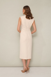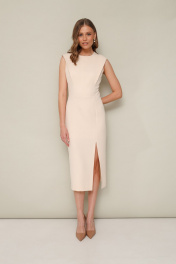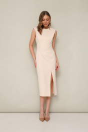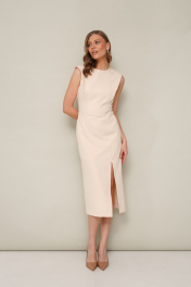 Лаконичное платье прилегающего силуэта, отрезное по талии, выполнено из плательной ткани. Округлый вырез горловины. Лиф по переду и спинке с конструктивными складками в рельефах. Юбка с высоким разрезом по левой стороне. Застежка в среднем шве спинки на потайную молнию. Платье обработано подкладкой.