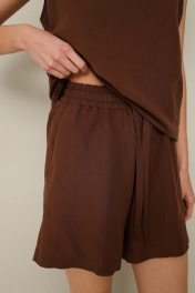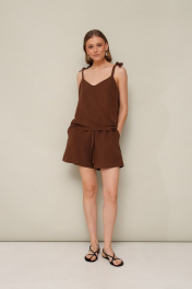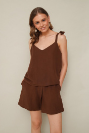 Стильный 2-х предметный комплект, состоящий из топа и шорт, выполнен из натуральной ткани. Топ свободного кроя с округлым вырезом горловины, с акцентными бретельками на завязках. Шорты с притачным поясом на резинке с декоративной завязкой, в боковых швах обработаны наклонные карманы.