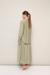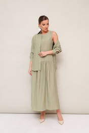 Элегантный 2-предметный комплект, состоящий из платья и блузки. Платье отрезное ниже линии талии. Округлый вырез горловины. Лиф с рельефными швами, спинка с центральной застежкой на потайную молнию. Юбка с легкой сборкой по шву притачивания. Платье на хлопковой подкладке. Блузка прямого кроя, горловина с рубашечным воротником со стойкой. Застежка центральная на петли и пуговицы. Спущенная линия втачивая рукава, манжеты с застежкой на пуговицы. В боковых швах обработаны фигурные разрезы. Спинка с отрезной кокеткой и встречной складкой.