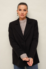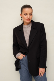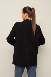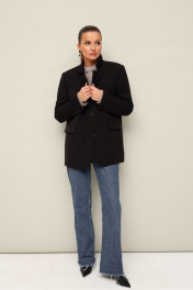 Жакет актуального прямого кроя, выполнен из костюмной ткани. Воротник пиджачного типа с отложными лацканами, край борта скругленный по низу жакета. Спереди обработаны прорезные карманы в рамку с клапанами. Рукава втачные двухшовные со шлицей и пуговицами. Спинка со средним швом, переходящим в высокую шлицу с застежкой на петли и пуговицы. Жакет на подкладке.