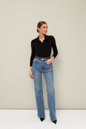 Трикотажное поло с отложным воротником с цельнокроеной стойкой. Вырез горловины обработан притачными планками с застежкой на петли и пуговицы. Втачные длинные рукава.
