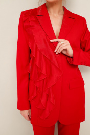 Комплект 2-предметный, состоящий из жакета и брюк, выполненный из костюмной ткани. Жакет полуприлегающего силуэта, с центральной застежкой на петли и пуговицы. Воротник пиджачного типа с отложными лацканами, край борта скругленный по низу жакета. Спереди прорезной карман в рамку с клапаном. По правой полочке обработан декоративный элемент в виде настрочных воланов. Рукава втачные, двухшовные с вытачными шлицами с пуговицами. Спинка с рельефами и средним швом, переходящим в шлицу. Жакет на подкладке. Брюки классического кроя с заутюженными стрелками и с боковыми наклонными карманами. Пояс притачной с застежкой на пуговицу и тесьму-молнию, сзади на резинке, для регуляции размера.