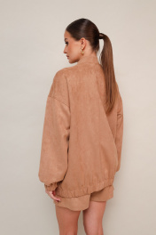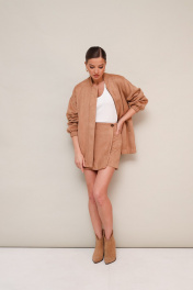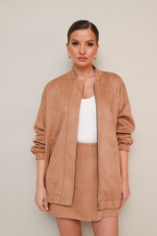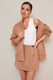 Комплект, состоящий из бомбера и юбки-шорт. Комплект выполнен из качественной экозамши. Бомбер актуального прямого силуэта с центральной застёжкой на молнию и воротником-стойкой. По переду функциональные карманы-листочки. Рукава со спущенной линией втачивания плеча. Низ бомбера и манжеты рукавов обработаны резинкой. Спинка со средним швом. Изделие на подкладке. Юбка-шорты в длине мини, на обтачке по поясу. Спереди имитация юбки на запах с застежкой на пуговицу. Основная застёжка в боковом шве на потайную тесьму-молнию