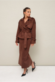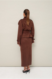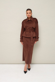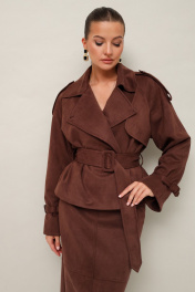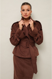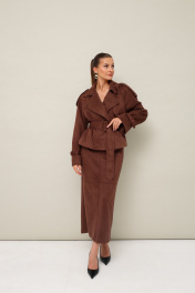 Стильный 2-предметный комплект, состоящий из жакета и юбки, выполненный из экозамши. Жакет современного прямого силуэта, двубортный с застежкой на петли и пуговицы. По плечевому шву обработаны погоны. Воротник пиджачного типа с отложными лацканами. Спереди отлетная кокетка. Рукава кроя реглан, с патами по низу, с фиксацией на пряжки. Спинка со средним швом. Изделие на подкладке. В комплекте пояс из основной ткани с пряжкой. Юбка на подкладке в длине миди с боковыми наклонными карманами. Притачной пояс с застежкой в среднем шве по спинке на пуговицу и потайную молнию. Для удобства движения сзади обработана шлица.