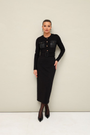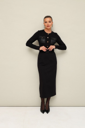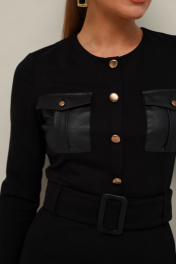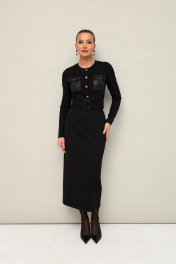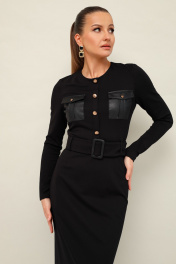 Платье прилегающего силуэта, отрезное по линии талии, выполнено из эластичного трикотажного полотна. Горловина округлой формы. По лифу обработана планка с пуговицами и нагрудные накладные карманы с клапанами. Длинные втачные рукава. Спинка с застежкой на потайную молнию в среднем шве. Для удобства движения сзади обработан разрез. По поясу предусмотрены шлевки. В комплекте прилагается пояс из основной ткани с пряжкой.