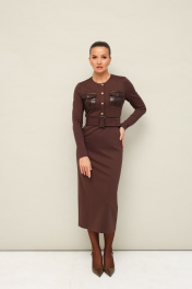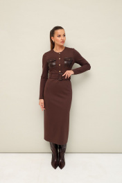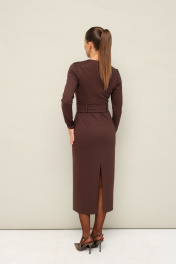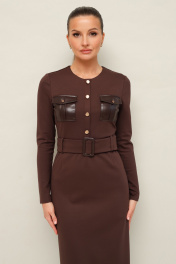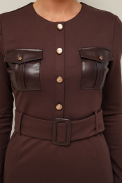 Платье прилегающего силуэта, отрезное по линии талии, выполнено из эластичного трикотажного полотна. Горловина округлой формы. По лифу обработана планка с пуговицами и нагрудные накладные карманы с клапанами. Длинные втачные рукава. Спинка с застежкой на потайную молнию в среднем шве. Для удобства движения сзади обработан разрез. По поясу предусмотрены шлевки. В комплекте прилагается пояс из основной ткани с пряжкой.