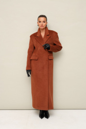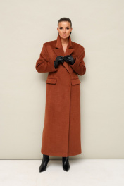 Демисезонное пальто прямого силуэта, выполнено из качественной пальтовой ткани. Воротник пиджачного типа с отложными лацканами. Двубортная застёжка на потайные пришивные кнопки. Слегка удлиненный плечевой шов. Спереди обработаны прорезные карманы в рамку с клапанами и нагрудный прорезной карман с листочкой. Рукава втачные, двухшовные. Спинка со средним швом, переходящим в шлицу. Пальто на подкладке.