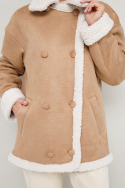 Женская дубленка прямого силуэта, длиной до середины бедра. Воротник и лацканы отложные. Застёжка двубортная на петли и обтяжные пуговицы. Спереди обработаны функциональные карманы с листочкой. Спущенная линия втачивая плеча, длинные двухшовные рукава с отворотом. Спинка с отрезной кокеткой. Дубленка декорирована искусственным мехом, который придает образу благородную мягкость и уют.