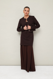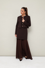 Стильный 3-х предметный комплект, состоящий из платья, юбки и жакета. Платье прилегающего силуэта, отрезное по линии талии в длине мини. Горловина оформлена вырезом каре. Застёжка в среднем шве по спинке на потайную молнию. Юбка А-силуэта в длине макси, выполнена из креп-шифона. Пояс юбки обработан резинкой для регуляции размера. Жакет полуприлегающего силуэта, с центральной застёжкой на петли и акцентные пуговицы. Длинные втачные рукава. Спинка со средним швом.