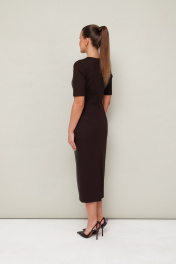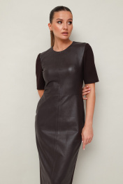 Стильное платье-футляр отрезное по линии талии, выполнено из экокожи и трикотажного полотна. Горловина округлой формы. Короткие втачные рукава. Застёжка по спинке в среднем шве на потайную молнию. Для удобства движения сзади обработан разрез.
