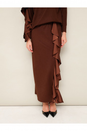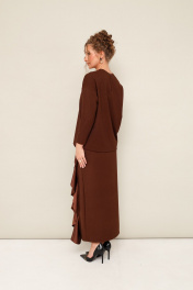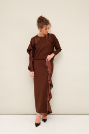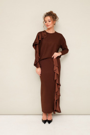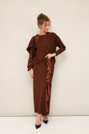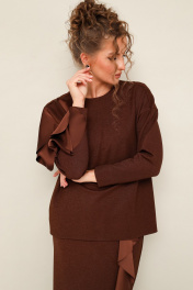 Элегантный трикотажный комплект, состоящий из джемпера и юбки. Джемпер прямого силуэта со спущенной линией втачивания плеча, рукава в длине 7/8. По спинке разрез с застежкой на пуговицу и навесную петлю. Юбка в длине миди с притачным поясом на резинке. Спереди обработан высокий разрез. Комплект декорирован двойным сатиновым воланом по плечевому шву, рукаву и по вертикальному подрезу в юбке.