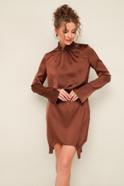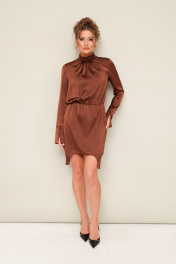 Стильное платье полуприлегающего силуэта, выполнено из струящейся ткани с матовым блеском. Платье отрезное по линии талии на резинке. Горловина с отрезной стойкой и лиф переда декорированы складками. Втачные длинные рукава с манжетами. В среднем шве спинки обработана застёжка на стойке на пуговицы и навесные петли. Низ платья фигурной формы.