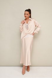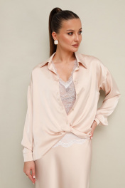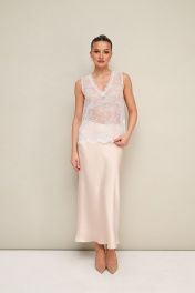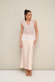 Элегантная блузка прямого кроя, выполнена из струящейся ткани с благородным матовым блеском. Горловина с рубашечным воротником на отрезной стойке, центральная застежка на петли и пуговицы. Перед блузки выполнен с декоративным перекрутом в низжней части застежки. Рукава со спущенной линией втачивания плеча, манжеты с застежкой на петли и пуговицы. Спинка с отрезной кокеткой и бантовой складкой. Топ прямого силуэта, выполнен из изысканного французского кружева. V-образный вырез горловины обработан кружевной отделкой.