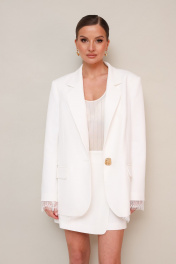 Жакет актуального прямого кроя, выполнен из костюмной ткани. Воротник пиджачного типа с отложными лацканами, край борта скругленный по низу жакета. Спереди обработаны прорезные карманы в рамку с клапанами. Рукава втачные двухшовные. Спинка со средним швом. Низ жакета и рукавов декорирован французским кружевом. Жакет обработан подкладкой.