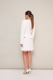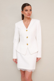 Комплект, состоящий из жакета, юбки и шарфа, выполнен из костюмной ткани. Силуэтный жакет актуального кроя с V-образным вырезом горловины. Центральная застёжка на петли и пуговицы. Рукава втачные, двухшовные. Юбка в длине мини, на обтачке по поясу, с застежкой на потайную молнию в среднем шве спинки. Низ юбки декорирован французским кружевом. Жакет и юбка обработаны подкладкой.