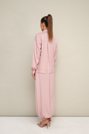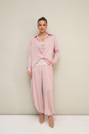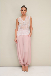 3-х предметный комплект: топ, блузка и брюки-алладины. Элегантная блузка прямого кроя, выполнена из струящейся ткани с благородным матовым блеском. Горловина с рубашечным воротником на отрезной стойке, центральная застежка на петли и пуговицы. Перед блузки выполнен с декоративным перекрутом в низжней части застежки. Рукава со спущенной линией втачивания плеча, манжеты с застежкой на петли и пуговицы. Спинка с отрезной кокеткой и бантовой складкой. Топ прямого силуэта, выполнен из изысканного французского кружева. V-образный вырез горловины обработан кружевной отделкой. Комфортные брюки-алладины свободного силуэта с боковыми наклонными карманами. Притачной пояс и манжеты на резинке.