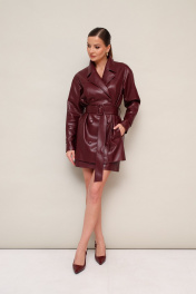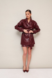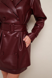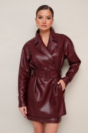 Стильный 2-предметный комплект, состоящий из жакета и юбки, выполненный из экокожи. Жакет современного прямого силуэта, двубортный с застежкой на петли и обтяжные пуговицы. Воротник пиджачного типа с отложными лацканами. Перед и спинка с отрезной кокеткой с рельефами. Спереди в рельефных швах обработаны внутренние функциональные карманы. Рукава со спущенной линией втачивания плеча, по низу паты, с фиксацией на обтяжные пуговицы. В комплекте пояс из основной ткани с пряжкой. Юбка в длине мини, на обтачке по поясу. Застёжка по спинке в среднем шве на потайную молнию. Жакет и юбка обработаны подкладкой.